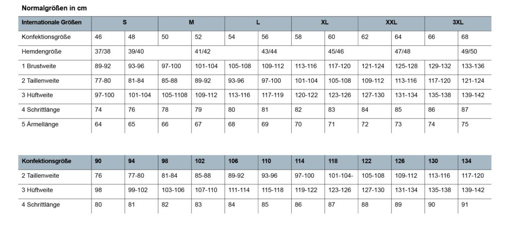 | Normalgrößen: | Körpergröße | Brust | Bund | Schritt | vordere Ärmellänge |