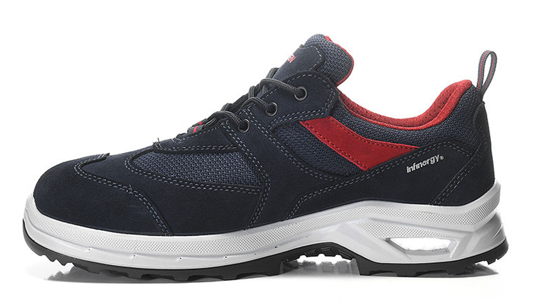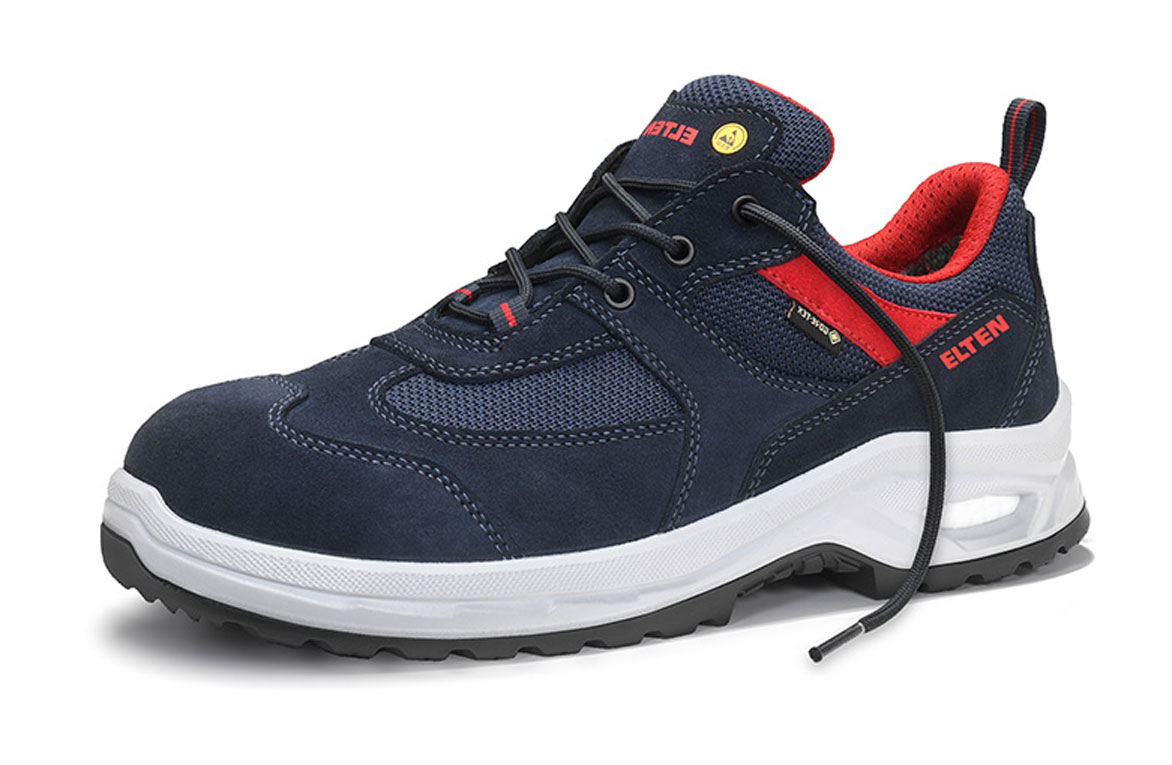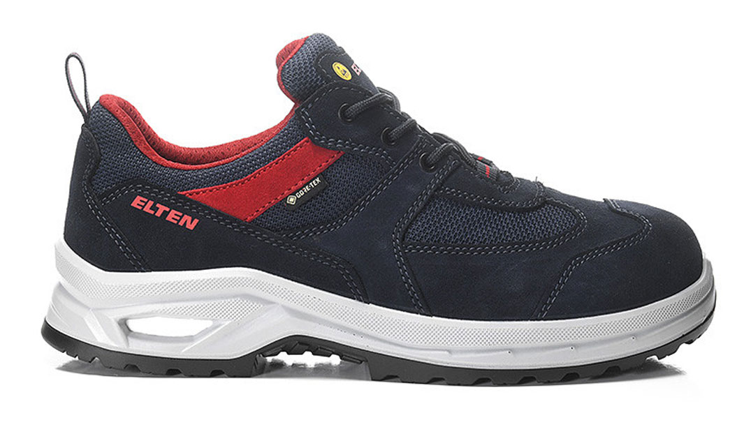 Der ROBSON XXP GTX blue-red Low ESD S2 wirkt mit seinem blau-roten Design wie ein lässiger Freizeitschuh, aber er ist ein lupenreiner S2-Sicherheitsschuh. S2 heißt, er hat keinen Durchtrittschutz, darum ist er hauptsächlich für Einsatzbereiche gedacht, in denen keine Gefahr durch herumliegende, spitze Objekte am Boden besteht. Also zum Beispiel in der Lebensmittelindustrie, als Maler und Elektriker aber auch in Laboren und Reinräumen. Schaut man sich das Gefährdungspotenzial in diesen Arbeitsbereichen genauer an, dann wird klar, wo der Schuh zum Einsatz kommen kann. In der Lebensmittelverarbeitung sind wasserdichte Schuhe wichtig, da oft mit Wasser und Reinigungsmitteln gearbeitet wird. Da ist dieser Schuh quasi zu Hause, denn das hydrophobierte Obermaterial aus Veloursleder und Textil ist wasserabweisend und die innen verarbeitete GORE-TEX Performance Comfort Footwear macht ihn sogar komplett wasserdicht. Die Stahlkappe im Schuh schützt vor mechanischen Einwirkungen und herunterfallendem Werkzeug. Seine ESD-Fähigkeit ist besonders für Elektriker wichtig, um elektrostatische Entladungen zu vermeiden, aber auch in Laboren und Reinräumen, um empfindliche Geräte oder Materialien vor Schäden zu schützen. Weil man in all diesen Arbeitsbereichen auch gerne mal länger auf den Beinen ist, kommt das Extrafeature der WELLMAXX PEAK-Serie, aus der dieser Schuh stammt, besonders zur Geltung: der Sohlenkern aus Infinergy® von BASF. Der schont Muskeln und Gelenke, weil sein dynamisches Inneres hervorragend dämpft und somit harte Böden gut auskontert. Mit den Zertifizierungen FO (Öl- und Kraftstoffresistenz), SR (Rutschhemmung), LG (Laddergrip), WR (Wasserdichtigkeit) und CI (Kälteisolierung) ist dieser Schuh auch für weitere Herausforderungen gewappnet, die auf ihn zukommen könnten.