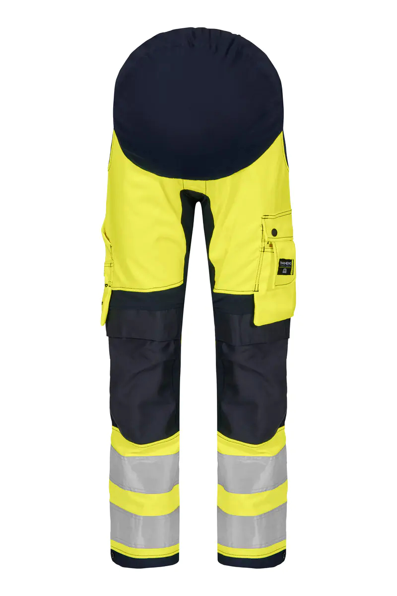 HI-VIS Umstandshose mit elastischem Strick und Knopfloch oben für einen wachsenden Bauch. Die Hose hat Stretch-Zonen und ein breites Gummiband im Rücken.
